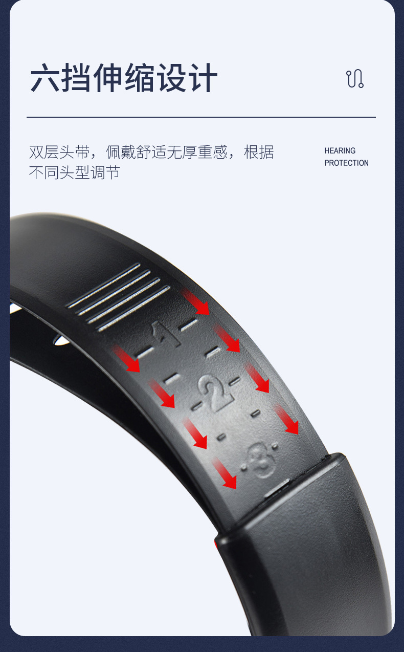 華特7302防噪音耳罩軟墊內(nèi)采用降噪海綿填充外部采用仿皮包邊柔和緊貼耳邊減少壓迫感;六擋伸縮設(shè)計(jì)雙層頭帶,佩戴舒適無(wú)厚重感,根據(jù)不同頭型調(diào)節(jié)。