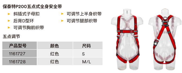 3M1161728保泰特P200五點(diǎn)式全身式安全帶包含合金鋼背部D型環(huán)、安全繩掛扣、穿過式帶扣和彈簧式上身調(diào)節(jié);