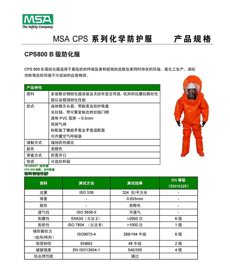 梅思安10124983CPS800防化服由多層特制的防化聚合物覆合而成,達(dá)到優(yōu)佳的化學(xué)防護(hù)性能及優(yōu)異物理面料性能,配合內(nèi)置空氣呼吸器使用,可提供Level B(B級(jí))防護(hù)。