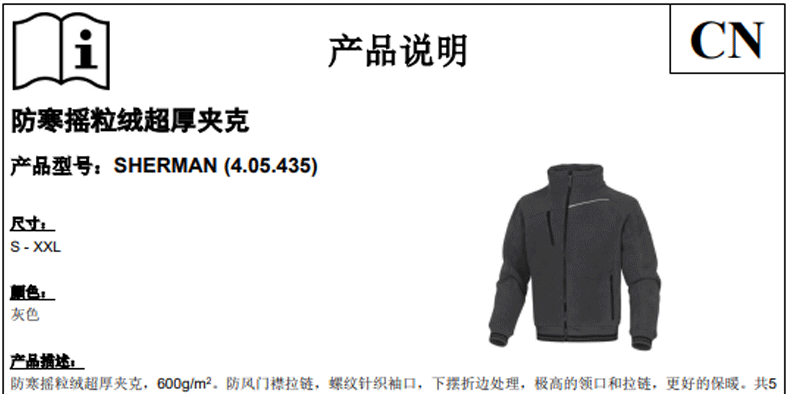 代爾塔405435搖粒絨超厚夾克防寒服600g/m2。防風(fēng)門襟拉鏈,螺紋針織袖口,下擺折邊處理,極高的領(lǐng)口和拉鏈,更好的保暖。共5個(gè)口袋,其中3個(gè)外部口袋,2個(gè)內(nèi)袋。