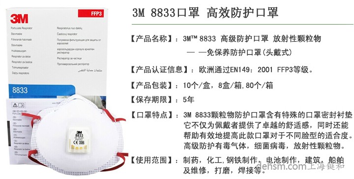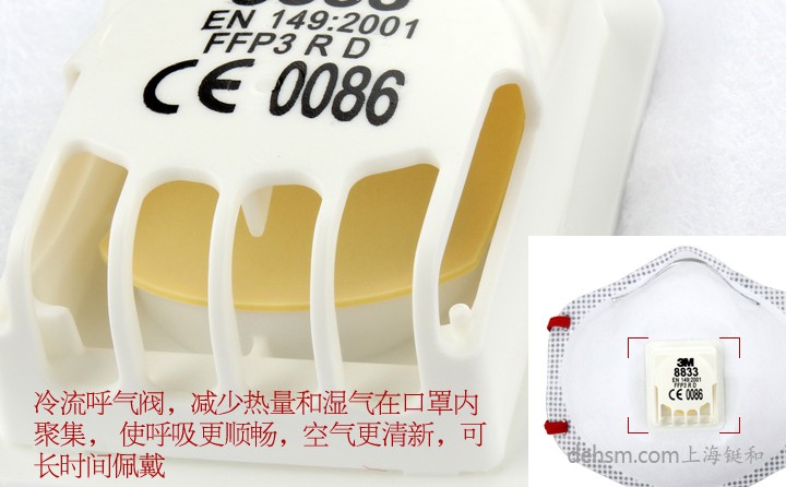 3M8833防毒口罩是高毒和放射性顆粒物防護(hù)口罩,高毒和放射性顆粒物防毒口罩。3m8833口罩帶呼氣閥設(shè)計的耳戴式白色防毒口罩,符合中國KN95標(biāo)準(zhǔn),同時獲得歐洲FFP3認(rèn)證,過濾效率大于95%。