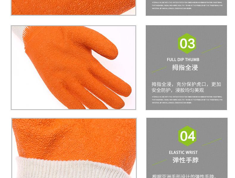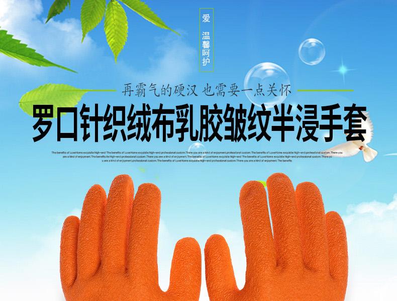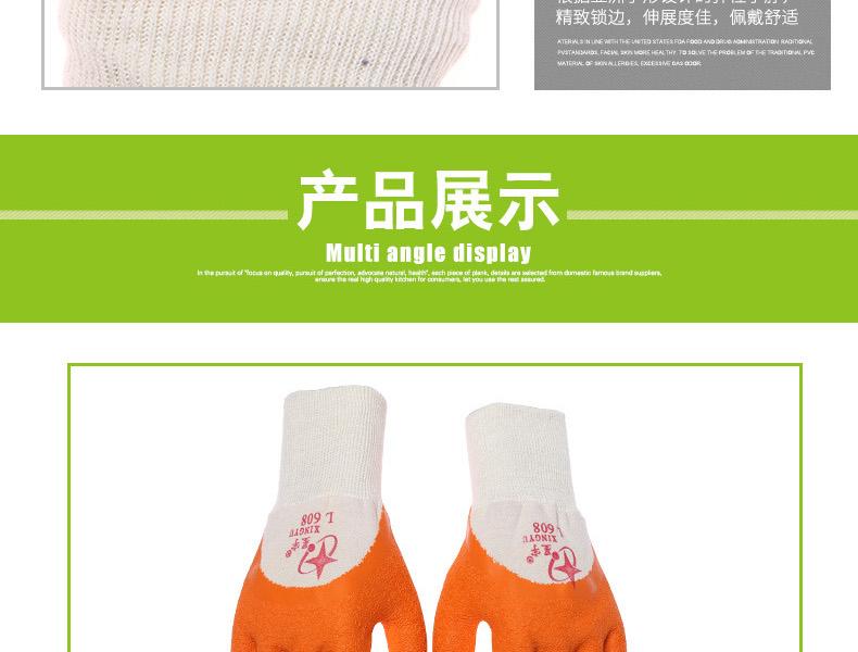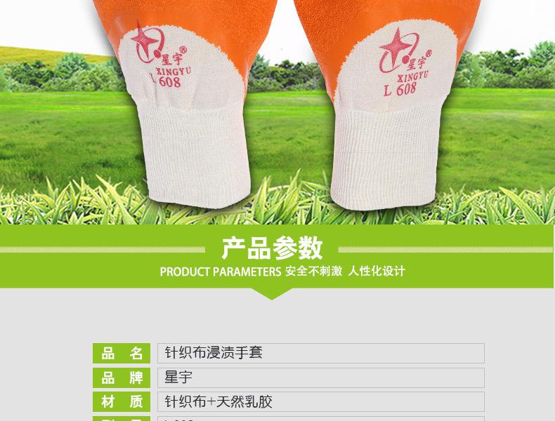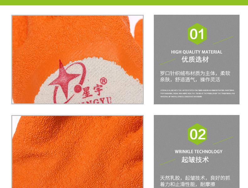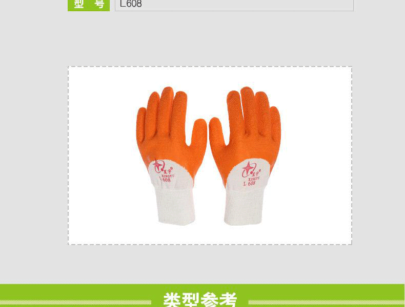 星宇L608乳膠皺紋半浸勞保手套針織布,天然乳膠。輕巧靈敏,柔軟舒適,良好的耐磨損性能;拇指全浸,充分保護(hù)虎口,更加安全防護(hù);彈性手脖,精致鎖邊,伸展度佳,佩戴舒適。
